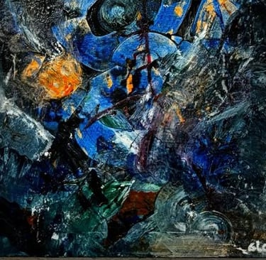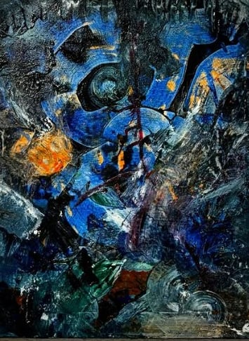 La couleur bleue domine, symbole de sérénité, de calme et d’espoir — des émotions que l’on retrouve dans ses compositions.